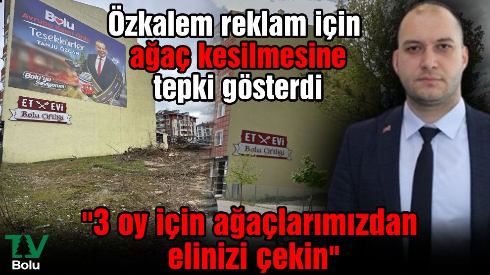Belediye Başkanı Tanju Özcan'ın bina duvarlarına asılan reklamlarının iyi görülebilmesi için önünü kapatan ağaçların kesildiğine dikkat çeken Ülkü Ocakları Bolu İl Başkanı Cihan Özkalem açtı ağzını yumdu gözünü. Özcan'ın 3 beş oy fazla almak için ağaç katliamı yaptığını söyledi ve "Tanju Özcan ağaç katilidir" dedi.