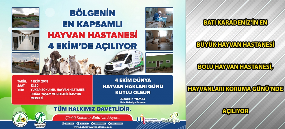 Batı Karadeniz’in en büyük hayvan hastanesi olma özelliğine sahip Bolu Hayvan Hastanesi, sokak hayvanları ve evcil türlerin yanı sıra büyük ve küçükbaş hayvanların da tedavi edilebildiği olanaklara sahip. Modern hastane 2 ameliyathane, kan tahlil laboratuvarı, yoğun bakım ünitesi, acil ünitesi, kedi bakım ünitesi-kedi oteli, dijital röntgen-ultrasonografi ve muayene, ameliyat öncesi ve sonrası bakım, hayvan yıkama ve kurutma odaları, yavrulu anne bölümü, karantina birimleri ve hayvan ambulansıyla dikkat çekiyor.