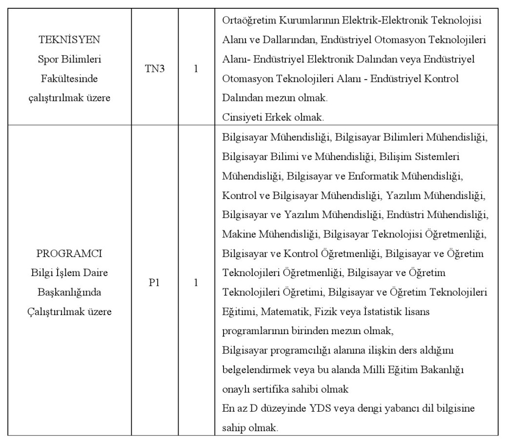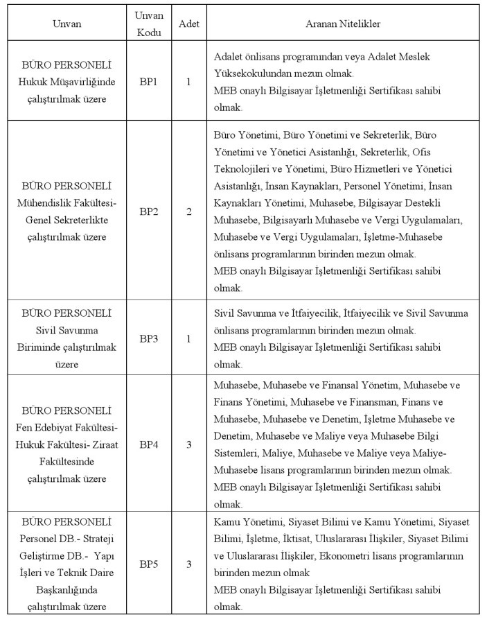 Üniversitemiz bünyesinde 657 sayılı Devlet Memurları Kanununun 4 üncü maddesinin (B) fıkrası uyarınca Sözleşmeli olarak istihdam edilmek ve tam zamanlı olarak çalıştırılmak üzere Sözleşmeli Personel Çalıştırılmasına İlişkin Esasların Ek 2 nci maddesinin (b) ve (c) fıkralarına göre öğrenim düzeyi ile KPSS (B) grubu puan sırası esas alınmak suretiyle Üniversitemiz Rektörlüğü bağlı birimlerinde istihdam edilmek ve ücretleri Özel Bütçeden karşılanmak üzere aşağıda belirtilen unvanlarda 20 (yirmi) adet sözleşmeli personel alınacaktır.