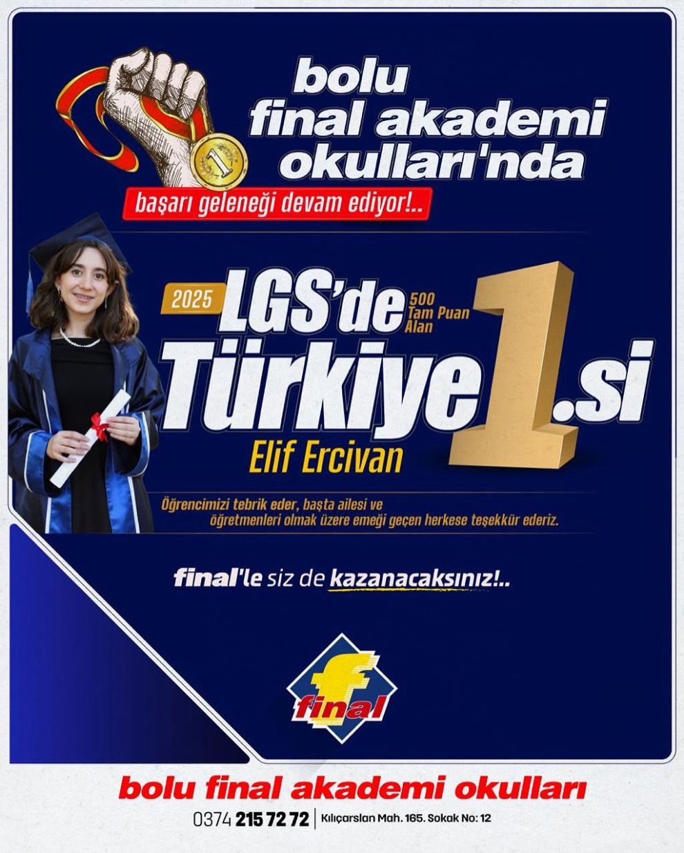 Bu büyük başarı; disiplinli çalışmanın, güçlü eğitim kadromuzun ve Final Okullarının köklü eğitim anlayışının bir sonucudur. Öğrencimizin azmi ve kararlılığı, ailemizin desteği ve öğretmenlerimizin rehberliğiyle birleşince, ortaya örnek bir başarı hikayesi çıktı.
