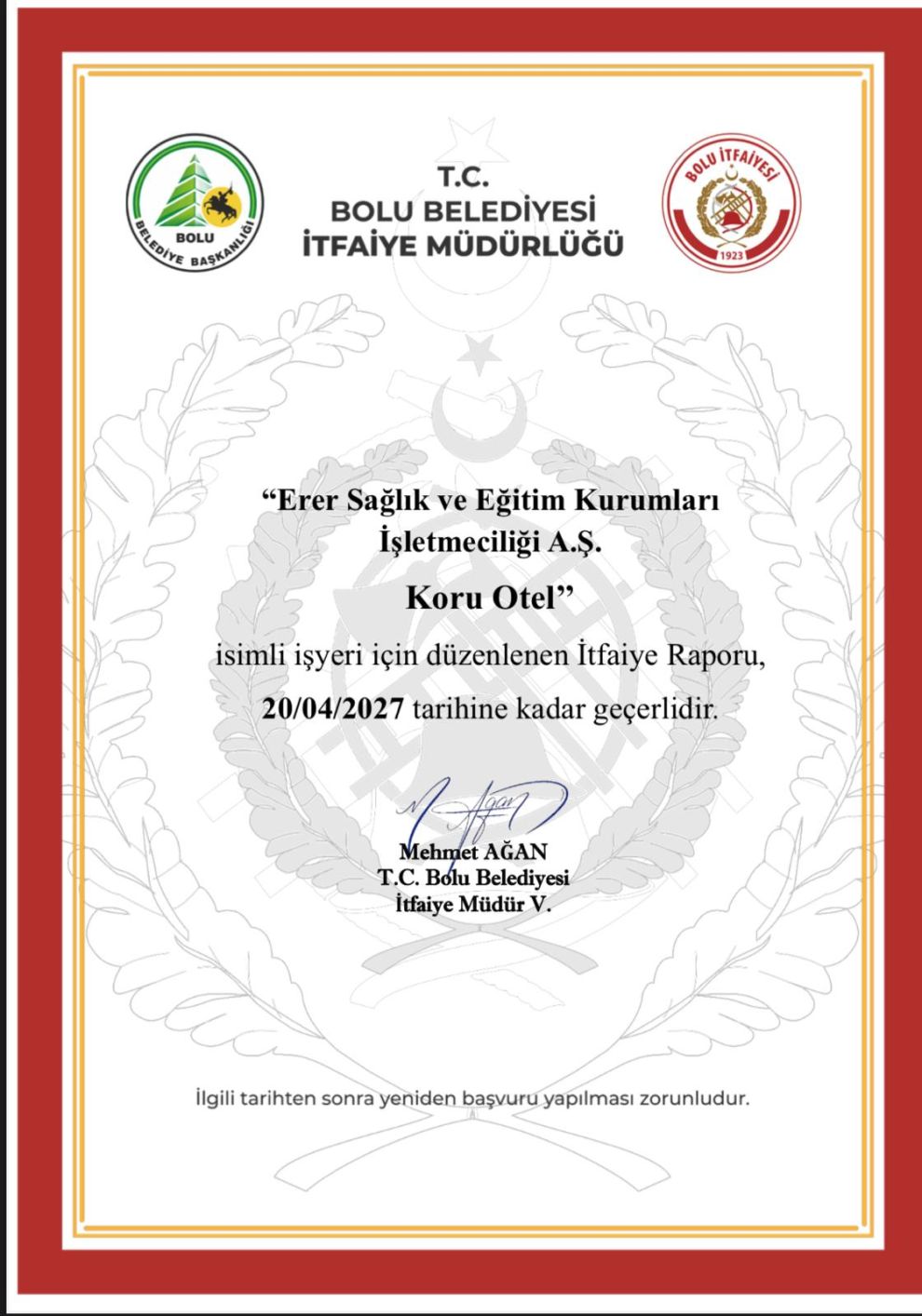 Koru Otel’in; yangın güvenliği, çevre duyarlılığı, teknik altyapı ve personel eğitimi gibi alanlarda ulusal ve uluslararası standartlara uygun şekilde faaliyet gösterdiğini belirten Yeşilkaya, “Sürdürülebilir turizm ilkelerine bağlı, doğaya ve insana saygılı hizmet anlayışımızla ülkemizin en güvenilir ve nezih tesislerinden biri olmaktan gurur duyuyoruz” dedi.