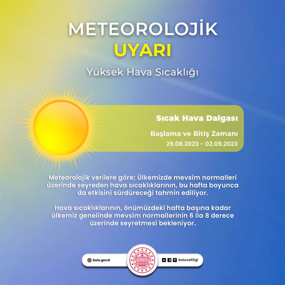Meteoroloji Genel Müdürlüğü verilerine göre; Bolu'da hava sıcaklığı cumartesi gününe kadar mevsim normalleri üzerinde 6 ila 8 derece üzerinde seyredecek. Bolu Valiliği tarafından meteorolojik verilere göre yapılan açıklamada, “Meteorolojik verilere göre; Ülkemizde mevsim normallerinin üzerinde seyreden hava sıcaklıklarının, bu hafta boyunca da etkisini devam ettireceği tahmin ediliyor. Hava sıcaklıklarının, önümüzdeki hafta başına kadar ülkemiz genelinde mevsim normallerinin 6 ila 8 derece üzerinde seyretmesi bekleniyor” ifadeleri kullanıldı.