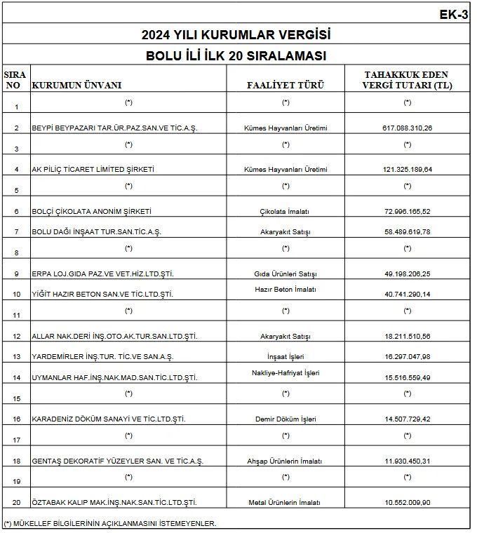 Bolu Defterdarlığı, 2024 yılı kurumlar vergisi listesini paylaştı. Bolu’da en çok vergi tahakkuk eden firmalar, kamuoyuyla paylaşıldı. Listede 20 firmaya yer verildi. Listenin birinci sırasındaki firmanın adı gizli tutuldu.