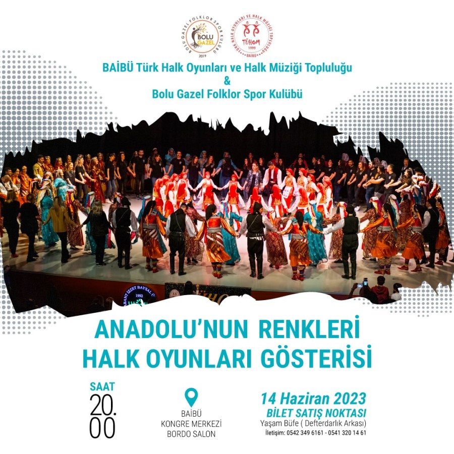 BAİBÜ Türk Halk Oyunları ve Halk Müziği Topluluğu ile Bolu Gazel Folklor Spor Kulübü'nün birlikte düzenledikleri Anadolu'nun Renkleri isimli halk oyunları gösterisi 14 Haziran Çarşamba saat 20:00'de BAİBÜ Kongre Merkezi'nde gerçekleştirilecek.