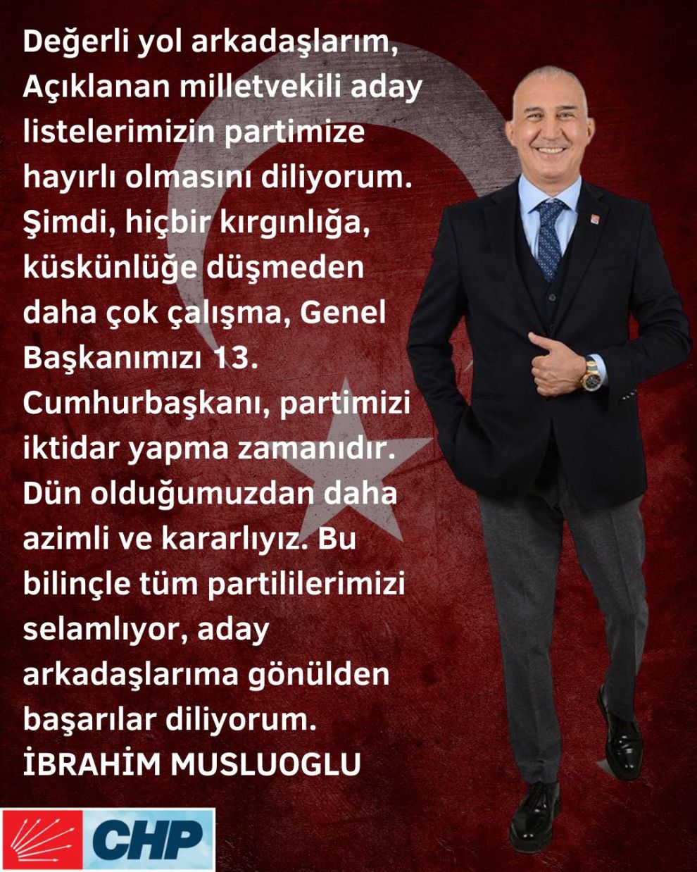 14 Mayıs'ta gerçekleştirilecek olan Cumhurbaşkanlığı Seçimi ve 28. Dönem Milletvekili Genel Seçimine ilişkin Cumhuriyet Halk Partisi'nde (CHP) aday listelerinin açıklanmasının ardından CHP Bolu Milletvekili Aday Adayı olan İbrahim Musluoğlu açıklanan aday listelerinde yer alamadı. Konuya ilişkin açıklama yapan Musluoğlu, CHP Bolu Milletvekili Adayı olanlara başarılar dileyerek, kırgınlık ya da küskünlük olmadan CHP adına daha çok çalışmak gerektiğini vurguladı. Musluoğlu açıklamasında , “Değerli yol arkadaşlarım, açıklanan milletvekili aday listelerimizin partimize hayırlı olmasını diliyorum. Şimdi, hiçbir kırgınlığa, küskünlüğe, düşmeden daha çok çalışma, Genel Başkanımızı 13. Cumhurbaşkanı , partimizi iktidar yapma zamanıdır. Dün olduğumuzdan daha azimli ve kararlıyız. Bu bilinçle tüm partililerimizi selamlıyor, aday arkadaşlarıma gönülden başarılar diliyorum.” iafadelerine yer verdi.