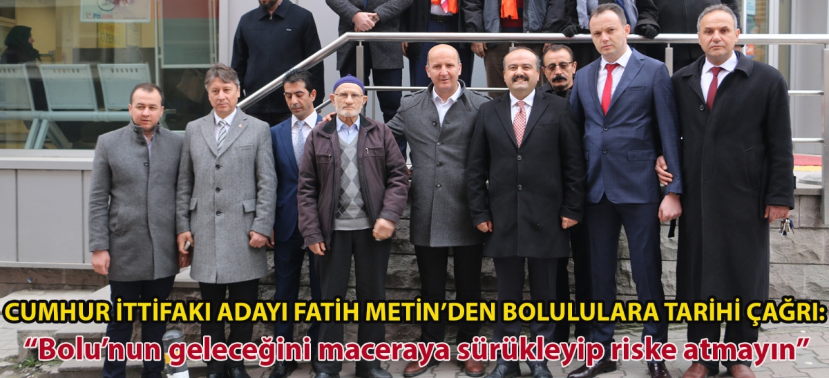 Metin, Bolu'nun geleceğini riske atmamaları konusunda Boluluları uyararak, "Bolu'nun geleceğini maceraya sürüklememek lazım... Bolu'nun geleceğini riske atmamak lazım... Çünkü yalanla dolanla, tek işi başkasının ürettiği işler üzerinden siyaset yapanlarla Bolu'nun işi olmaması lazım. Buna inanıyoruz, olmayacaktır. Bolu, Ak Parti'yi, Milliyetçi Hareket Partisi'ni Cumhur İttifakı'nı seviyor. Bunu en son 24 Haziran'da ispatladı. İnşallah bu sevgisinin devamını istiyoruz. Onlara da inşallah Cumhur İttifakı olarak layık olacağımızdan kimsenin kuşkusu olmasın. " dedi.