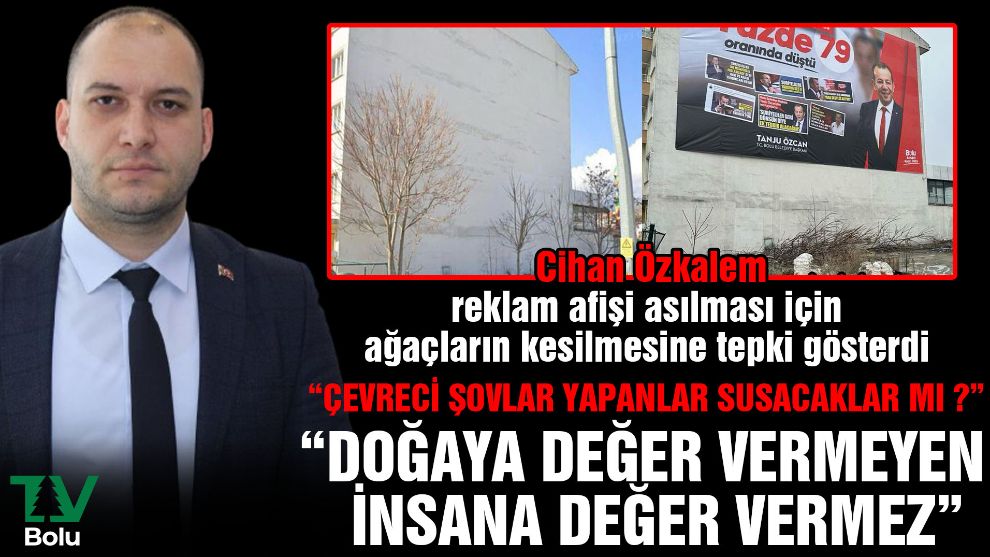 Ülkü Ocakları Bolu İl Başkanı Cihan Özkalem "Tanju Özcan, gerçek yüzünü göstermekte geç kalmadı" diyerek başladığı açıklamasında, "Önce 2020 yılında Cumhuriyet Caddesi üzerinde bulunan 50 yaşındaki bir ıhlamur ağacını kestirmişti. Geçen hafta da Bahçelievler’de D-100 Karayoluna cepheli bir binanın yanında bulunan ağaçları, sırf kendi reklam pankartının tam görülmesi için kestirdi. 2013’te Yuvaköy’de “Rant uğruna ağaçlar kesildi” diye meydana çıkan, 2014’te Kızık’ta “Sorumsuz kesimler yüzünden Bolu’da artık ağaç kalmadı” diye bağıran Tanju Özcan herhalde şimdi “sorumlu kesim” yapmaktadır ki bir seçim reklamı uğruna o kadar ağaca kıyabilmiştir. Tanju Özcan’a soruyorum: Tanju Özcan Gölcük’teki, Yuvaköy’deki, Kızık’taki ağaç da senin kestiklerin ağaç değil mi? Yoksa birkaç kareyle “çevre dostuyum” diye Bolu halkını oyaladığın “riya hikâyesinin” sonuna mı geldik?" dedi.