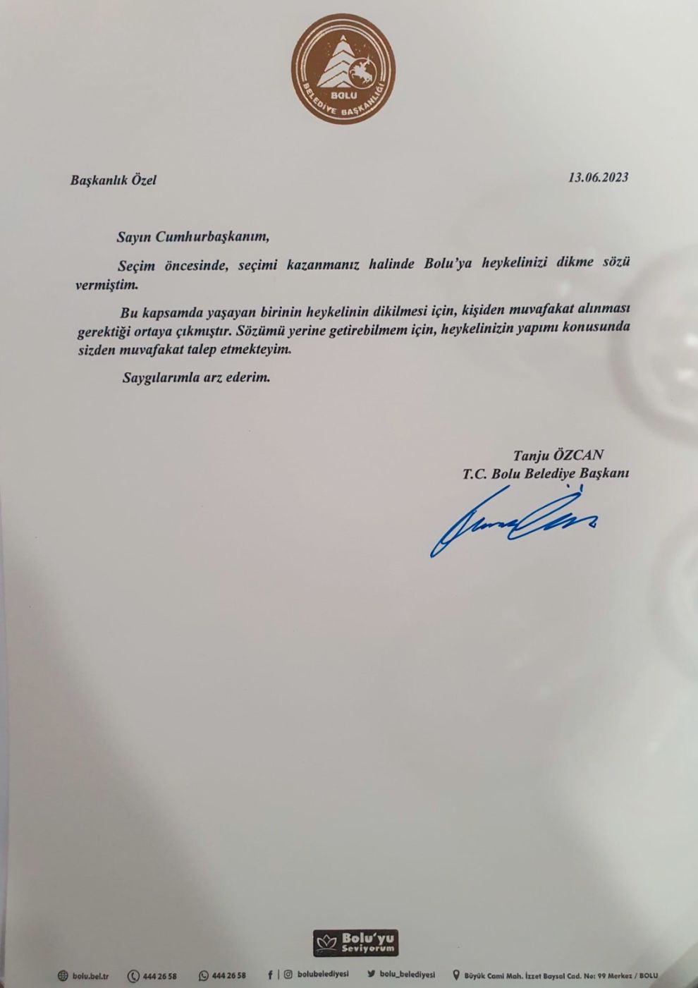 Seçimlerden önce Cumhurbaşkanı Recep Tayyip Erdoğan’ın seçimi yeniden kazanması halinde Bolu’ya heykelini dikeceğini söyleyen Bolu Belediye Başkanı Tanju Özcan, verdiği sözü yerine getirmek için ilk adımı attı. Bu kapsamda Cumhurbaşkanı Erdoğan’a hitaben bir mektup kaleme alan Özcan, Bolu’ya dikmeyi planladığı heykel için Cumhurbaşkanı Erdoğan’dan muvafakat (olur) istedi. Özcan gönderdiği mektubunda, “Seçim öncesinde, seçimi kazanmanız halinde, Bolu’ya heykelinizi dikme sözü vermiştim. Bu kapsamda yaşayan birinin dikilmesi için, kişiden muvafakat alınması gerektiği ortaya çıkmıştır. Sözümü yerine getirebilmem için, heykelinizin yapımı konusunda sizden muvafakat talep etmekteyim. Saygılarımla arz ederim.” ifadelerini kullandı.