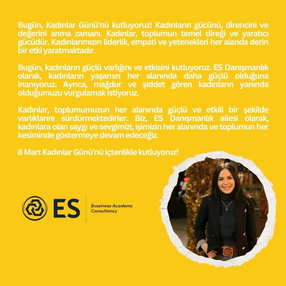 ES Danışmanlık Yönetim Kurulu Başkanı Serap Karakaya'nın 8 Mart Dünya Kadınlar Günü nedeniyle yayımladığı mesaj şu şekilde; "Bugün, Kadınlar Günü'nü kutluyoruz! Kadınların gücünü, direncini ve değerini anma zamanı. Kadınlar, toplumun temel direği ve yaratıcı gücüdür. Kadınlarımızın liderlik, empati ve yetenekleri her alanda derin bir etki yaratmaktadır. Bugün, kadınların güçlü varlığını ve etkisini kutluyoruz. ES Danışmanlık olarak, kadınların yaşamın her alanında daha güçlü olduğuna inanıyoruz. Ayrıca, mağdur ve şiddet gören kadınların yanında olduğumuzu vurgulamak istiyoruz. Kadınlar, toplumumuzun her alanında güçlü ve etkili bir şekilde varlıklarını sürdürmektedirler. Biz, ES Danışmanlık ailesi olarak, kadınlara olan saygı ve sevgimizi, işimizin her alanında ve toplumun her kesiminde göstermeye devam edeceğiz.