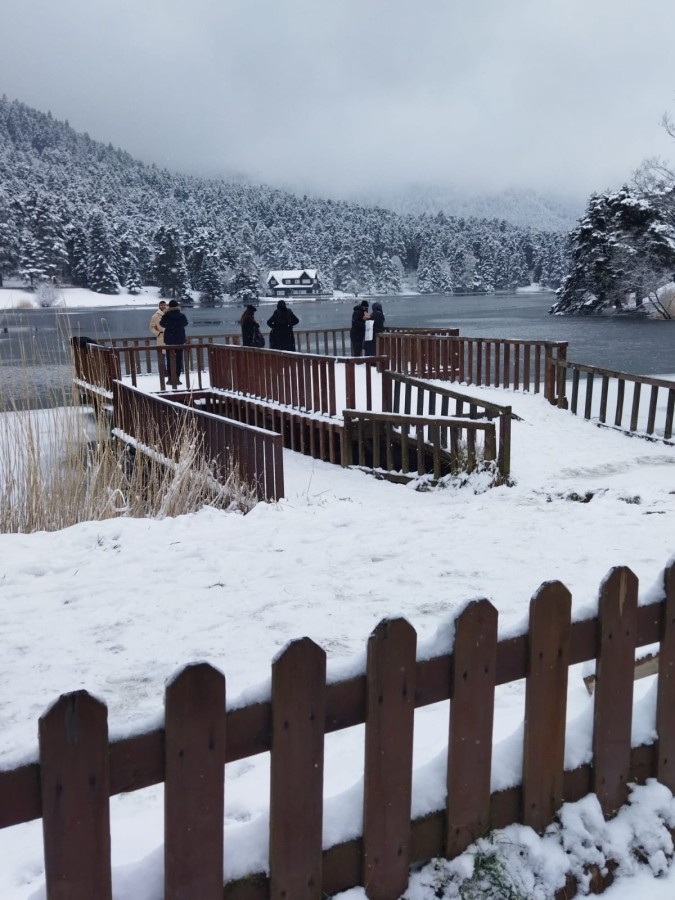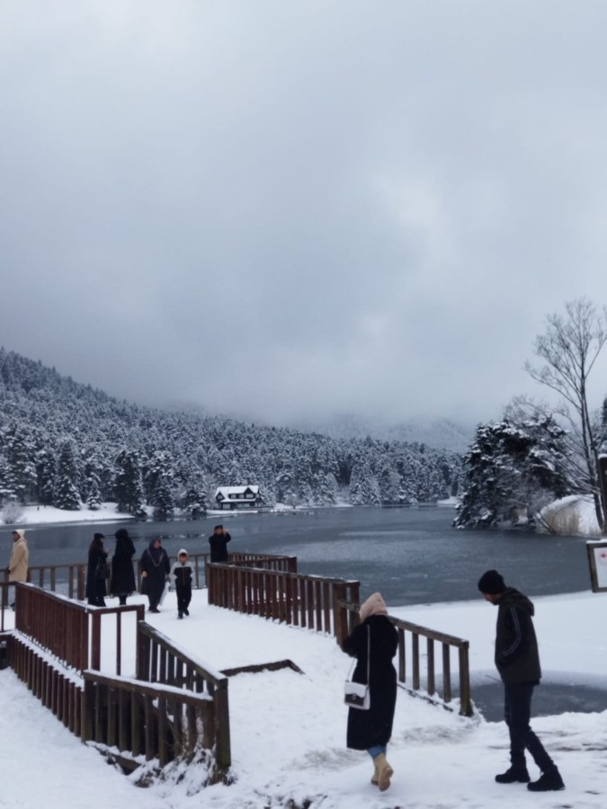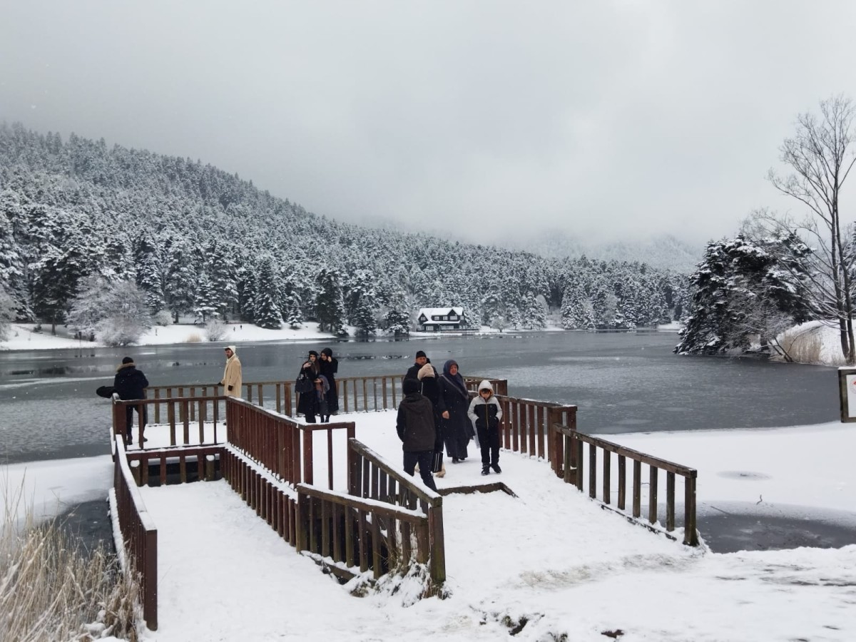 Bolu’da çam ormanları arasında yer alan Gölcük Tabiat Parkı, kentin yüksek kesimlerinde etkili olan kar yağışıyla birlikte beyaz örtüyle kaplandı. Tabiat parkında kar kalınlığı yaklaşık beş santime ulaştı. Gece saatlerinde hava sıcaklığının sıfırın altında 7 dereceye kadar düştüğü Gölcük’te bulunan gölün yüzeyi de dondurucu soğuk nedeniyle buz tuttu. Tatilciler soğuk havaya rağmen eşsiz manzarasıyla büyüleyen Gölcük’te göl çevresinde yürüyüş yapıp karın tadını çıkardılar. Bazı tatilcilerde golf araçlarıyla göl turu atarak bol bol fotoğraf çektiler.
