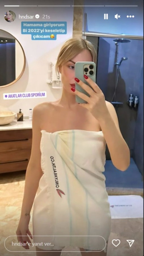 Hamamda çekildiği havlulu pozu takipçileriyle paylaşan ünlü spiker paylaşımına "Hamama giriyorum, bir 2022'yi keseletip çıkacağım" notunu ekledi.