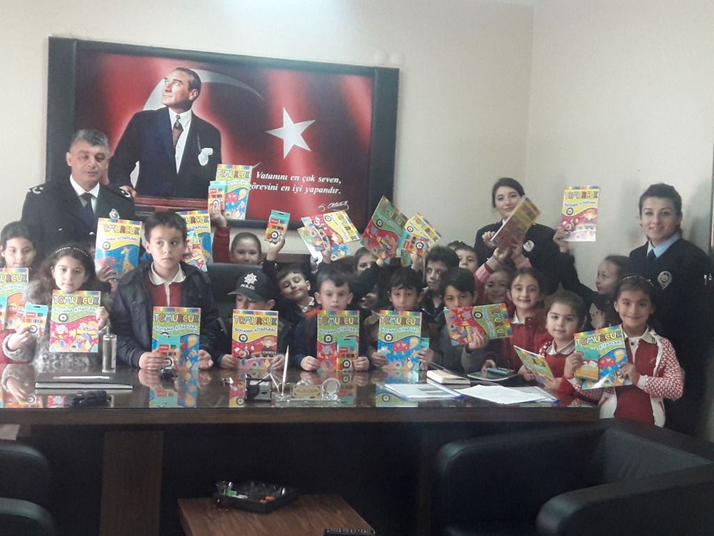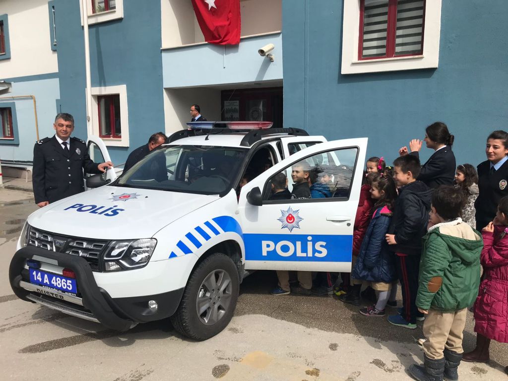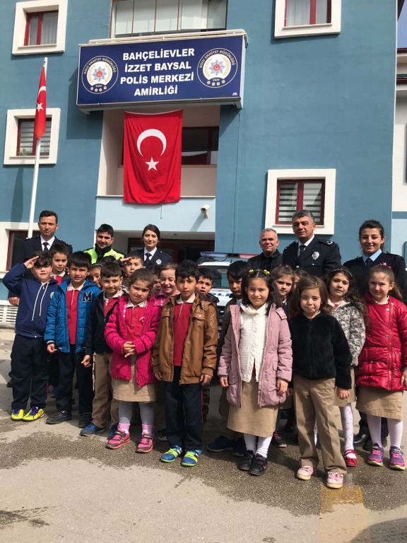 Bahçelievler Polis Merkezi’nde Emniyet Amiri Ali Çalışkan ve polis memurları tarafından karşılanan öğrenciler önce polis merkezini gezdi. Merkezin birimlerini dolaşan öğrencilere Polis Merkezi Amiri Ali Çalışkan, Bolu İl Emniyet Müdürü Adnan Erdoğan’ın hazırlattığı hediyelerini verdi. Polis abilerinin ve ablalarının nasıl çalıştığı hakkında bilgiler alan minikler polis şapkaları takarak polis araçlarına bindi. Renkli ziyaret sırasında öğrencilerden bazıları Polis Merkezi Amiri Ali Çalışkan’ın makamına oturarak poz verdi.