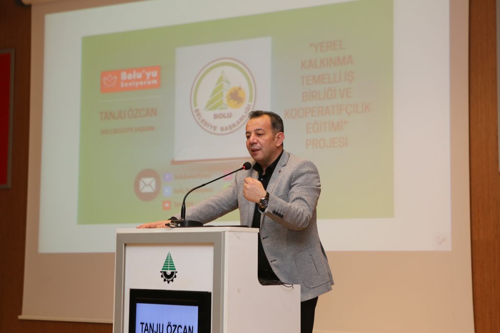 Ateş’in ardından katılımcılara hitap eden Bolu Belediye Başkanı Tanju Özcan da kooperatifçilik kültürünün yakın zamana kadar unutulmaya yüz tuttuğunu belirtti. Özcan konuşmasında, “Gerçekten kooperatifçilik konusu Türkiye’de aslında unutulmaya yüz tutmuştu yakın zamana kadar. Biz aslında kooperatiflerle yeni tanışmadık. 80’li yılları hatırlarsanız, yapı kooperatifleri Türkiye’de çok yaygındı. Bolu’daki, Köroğlu, Özlem, Yunus Emre siteleri bunların örneğiydi aslında. İlk yapı kooperatifleri 80’li yıllarda çok hareketlenmişti. Sonrasında unutuldu. İlimizde çok sayıda kooperatiften bahsedildi ama onların önemli bir kısmı Bolu’nun bitki örtüsü bakımından Türkiye’nin en zengin ili olması sebebiyle ve birçok köyünün orman köyü olması sebebiyle aslında bunlar orman kooperatifleri. Dolayısıyla tarımsal anlamda biraz fazla gelişmiş olabilir nüfusa göre ama tarımsal kooperatif anlamında çok fazla kooperatifimiz yok. Kendim hukukçuyum. Ama kooperatif nasıl kurulur? Kooperatifler nasıl tasfiye edilir? Şuanda hiç faal olmayan kooperatifler var. Onların nasıl tasfiye edileceğini hiçbirimiz bilmiyoruz. Bugün çok değerli konuklarımız var. Kooperatifler Birliği Başkanımız burada, değerli hocamız var. Neptün Hanım var. Neptün Hanım aynı zamanda bizim İzmir Büyükşehir Belediye Başkanımızın da eşi. Tunç Soyer’in de kooperatifçilik adına neler yapmaya çalıştığını ulusal basından takip ediyorsunuz. Ege bölgesi kooperatifçilik anlamında Türkiye’de en önde geliyor. Orada bu işi başarmışlar. Hatta geçen bizde Manisa’daki kooperatiften ciddi miktarda ağaç aldık. Kooperatiflerin avantajları fazla. Belediye gibi kurumlara ihalesiz sadece protokolle dahi hizmet satışı gerçekleştirebiliyor. Bolu olarak iki büyük şehrin arasındayız. 30-35 milyon insanın 2-2.30 saat gibi bir sürede ulaşabildiği bir şehiriz. Dolayısıyla sağlıklı işlerliği olan kooperatifler kuralım. Bugün Neptün Hanım ve değerli konuklarımızdan bunu öğrenelim. Ürettiğimiz ürünleri pazarlama noktasında bir sıkıntı yaşamadığımızı düşünüyorum. Bizde Bolu Belediyesi olarak, Ticaret odamızla birlikte bu konuda sizlere özel olarak katkı ve destek vermek istiyoruz. Hep birlikte başarabiliriz. Yaparsak bunu 4-5 yıl sonra belki kooperatifçilik konusunda konum avantajımızı da kullanarak çok çok iyi yerlere gelebiliriz diye düşünüyorum.” ifadelerini kullandı.