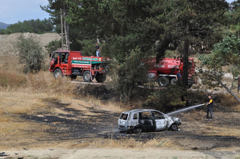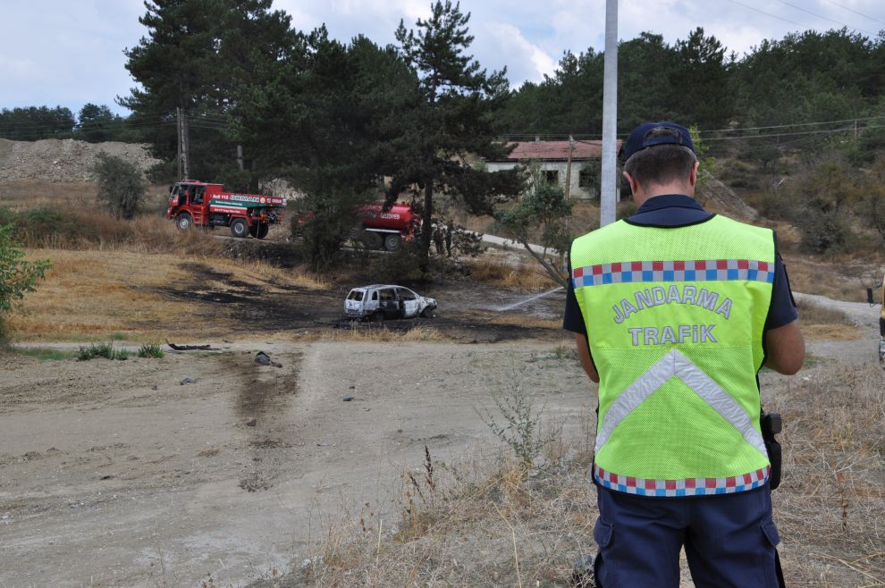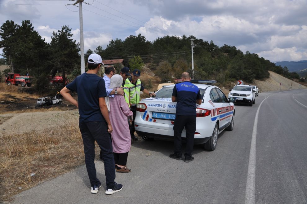 Mudurnu istikametinden Bolu'ya doğru ilerleyen 25 AL 888 plakalı aracın sürücüsü Hacer Bakan, Mangırlar Köyü sapağında önüne çıkan köpeğe çarpmamak için direksiyonu kırdı. Direksiyon hakimiyetini kaybeden Bakan'ın aracı yol kenarındaki dere yatağına uçtu. Araç yaklaşık 50 metre sürüklendikten sonra yanmaya başladı. Hacer Bakan, hızlı bir şekilde alev alan araçtan çıkarak hayatını kurtardı. Lpg'li olduğu öğrenilen araç kısa sürede alevlere teslim oldu. Çevredeki otların da tutuşmaya başladığı yangına bölgede bulunan Orman Müdürlüğüne bağlı arazöz ve Mudurnu İtfaiyesi müdahele etti. İtfaiye ekipleri hem yanan aracı hem de otları söndürerek yanıngının büyümesini önledi. Yangın sonucunda araç adeta küle döndü. Araç sürücüsü Hacer Bakan ise tüm olup biteni göz yaşları içerisinde izledi. Kazayı haber alan Bakan'ın yakınları olay yerine gelerek kadın sürücüyü teselli etmeye çalıştı.