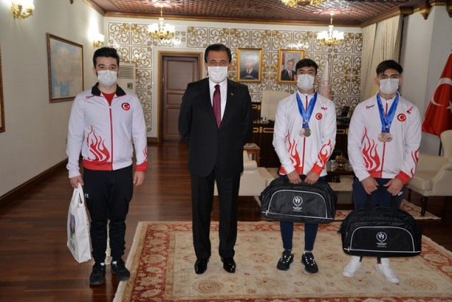 Milli Takım Sporcularımız Bora Tarhan ile Mert Efe Kılıçer ve Antrenör Ersin Yılmaz'ın, Bolu Valisi Ahmet Ümit'i makamında ziyaret ettiği görüşmeye Gençlik ve Spor İl Müdürü Şerafettin Çilkara, Spor Şube Müdürü Ramazan Demir'de katıldı.