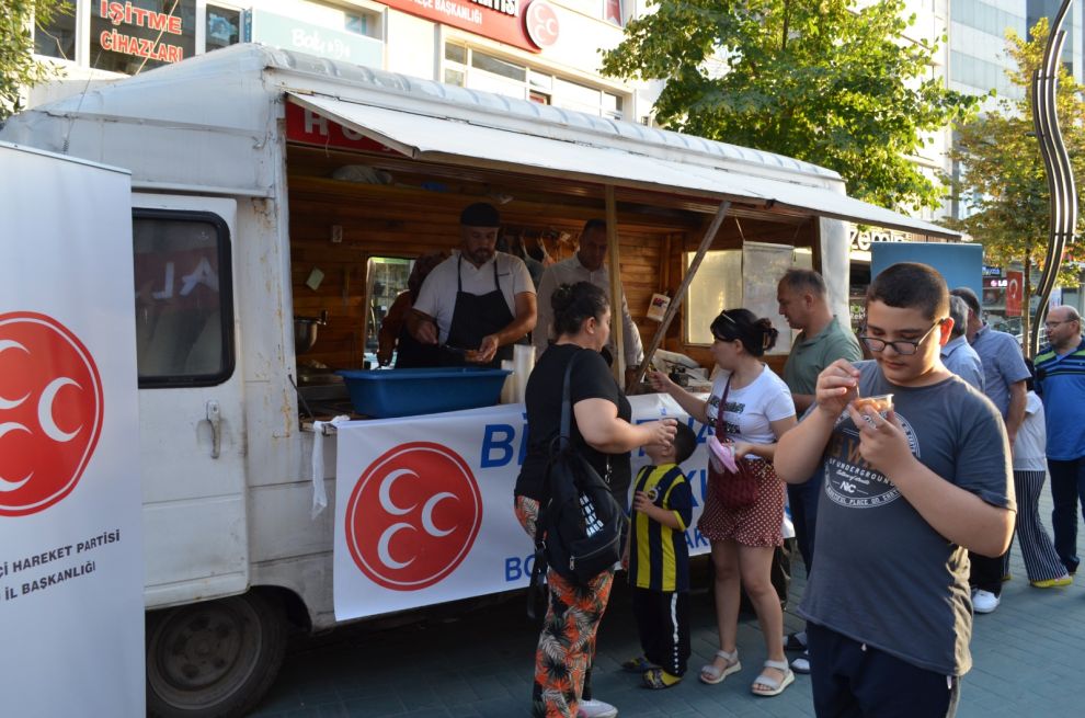 30 Ağustos Zafer Bayramı kapsamında Cumhuriyetimizin Kurucusu Gazi Mustafa Kemal Atatürk’ün başkomutanlığında Dumlupınar’da kazanılan büyük zaferin 101. yılı ilimiz Bolu’da sabah düzenlenen resmi programda büyük bir coşkuyla kutlandı. Milliyetçi Hareket Partisi(MHP) Bolu İl Başkanlığı ve Bolu Ülkü Ocakları da tarihe altın harflerle kazınan bu büyük zafere ulaşmamızı sağlayan aziz şehitlerimizi unutmadı. İzzet Baysal Caddesi üzerinde bulunan MHP ve Ülkü Ocakları İl Başkanlıklarının önünde Bolu halkına şehitlerimizin ruhlarına ithafen lokma dağıtımı gerçekleştirildi.Lokma dağıtımına MHP Bolu İl Başkanı İlhan Durak, MHP Bolu Milletvekili İsmail Akgül ve Bolu Ülkü Ocakları Başkanı Cihan Özkalem ile ülkücüler katıldılar. Etkinlikle Milletvekili Akgül, Başkan Durak ve Özkalem, hazırlanan lokmaları vatandaşlara elleriyle ikram ettiler. Lokma ikramı münasebetiyle şehitlerimizin ruhlarına bir Fatiha okunması arzu edilirken Akgül, Durak ve Özkalem vatandaşlarla kısa süre sohbet etti. MHP ve Ülkü Ocaklarından etkinlikle ilgili yapılan açıklamada, “30 Ağustos Zafer Bayramı sebebiyle, MHP Bolu İl Başkanlığı ve Bolu Ülkü Ocakları İl Başkanlığı tarafından şehitlerimizin ruhuna ve sevaplarına hitaben, teşkilatlarımızla beraber lokma dağıtıp, ruhlarına hediye eyledik. Yapmış olduğumuz bu etkinliğimizi Rabbim kabul etsin” ifadelerine yer verildi.