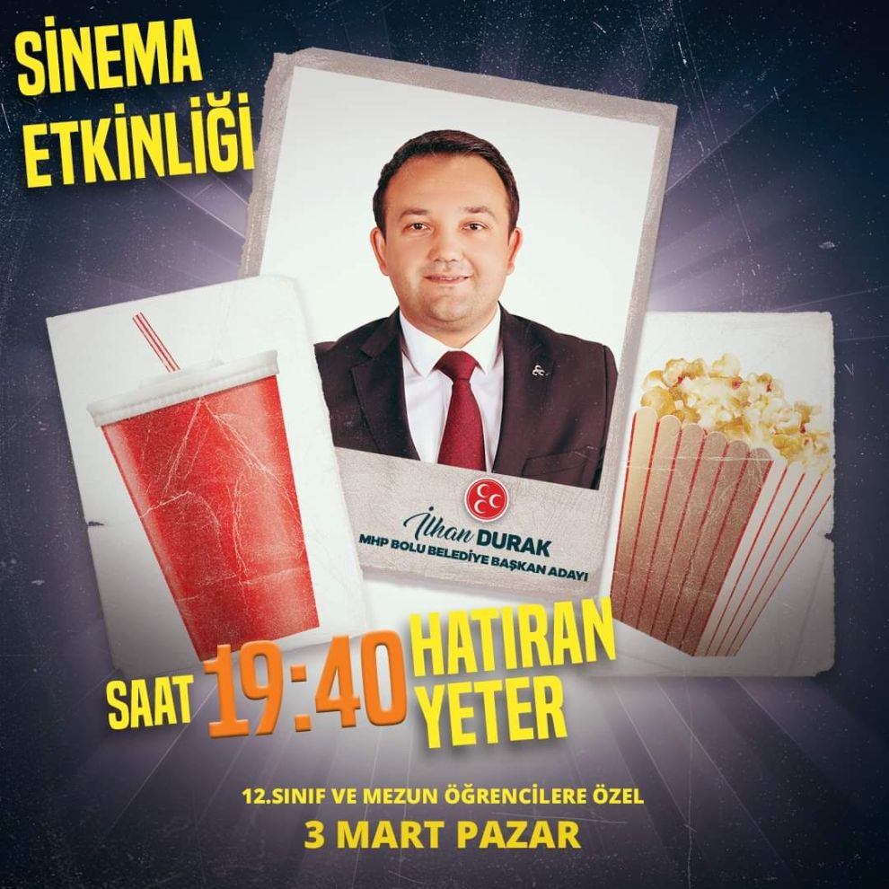 31 Mart’ta gerçekleştirilecek yerel seçimler önceci yaptığı saha çalışmalarında geçtiğimiz günlerde üniversite sınavına hazırlanan öğrencileri ziyaret eden ve onları motive edecek bir mektup gönderen Milliyetçi Hareket Partisi Bolu Belediye Başkan Adayı İlhan Durak, şimdi de stresli süreçten biraz olsun uzaklaşmaları adına sinema etkinliği düzenliyor. Bu akşam saat 19:00’da düzenlenecek etkinliğe katılmak isteyen öğrencilerin yapması gereken tek şey ise Durak’ın kendi sosyal medyasından paylaştığı sinema etkinliği paylaşımını beğenerek, hesapları takibe almak ve Türk Bayraklı yorum yapmak.