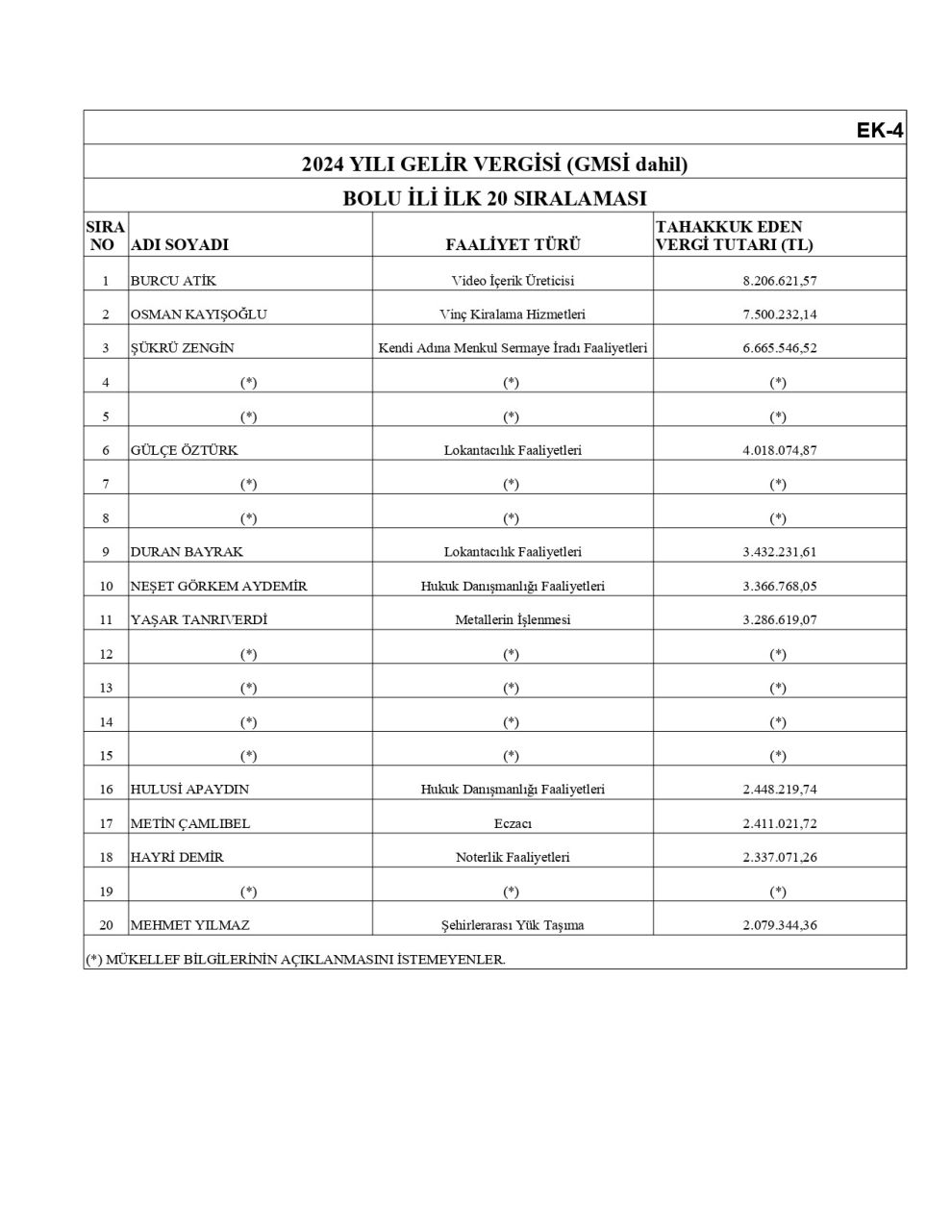Bolu Vergi Dairesi Başkanlığı, "2024 Yılı Gelir Vergisi Bolu İli İlk 20 Sıralaması" listesini yayımladı. Açıklanan listede, 2024 yılında en fazla vergi ödeyen mükelleflerin isimleri yer aldı. Sosyal medyada milyonlarca kişi tarafından takip edilen kamp içerikleriyle tanınan Burcu Atik'in listenin zirvesinde yer aldığı görüldü. Video içerik üreticisi Burcu Atik, 2024 yılı boyunca 8 milyon 206 bin 621 lira gelir vergisi ödedi. Listenin ikinci sırasında 7 milyon 500 bin liralık vergi ile vinç kiralama hizmeti veren Osman Kayışoğlu, üçüncü sırasında da 6 milyon 665 bin 546 lira vergi ödeyen Şükrü Zengin yer aldı.