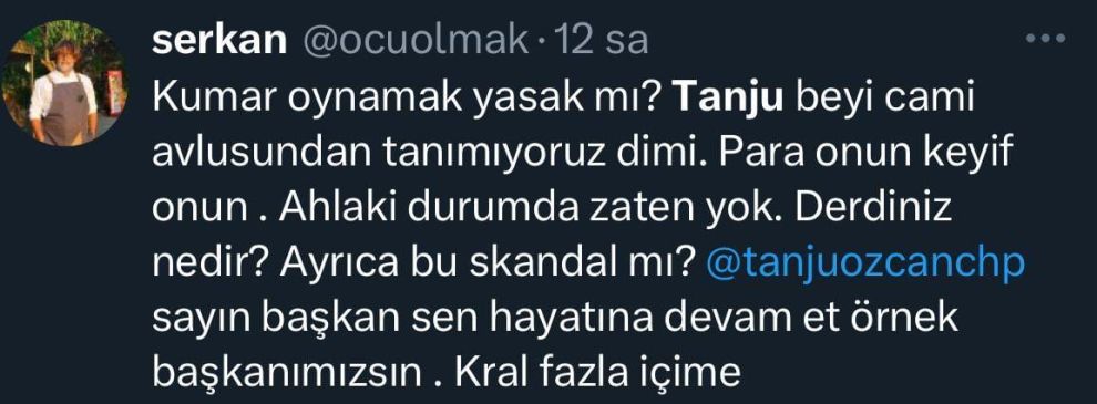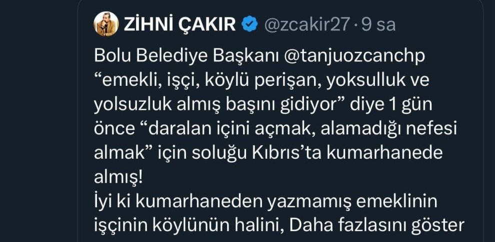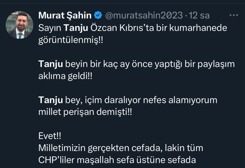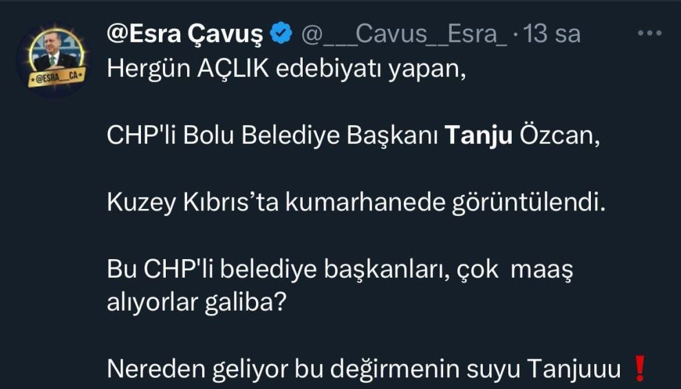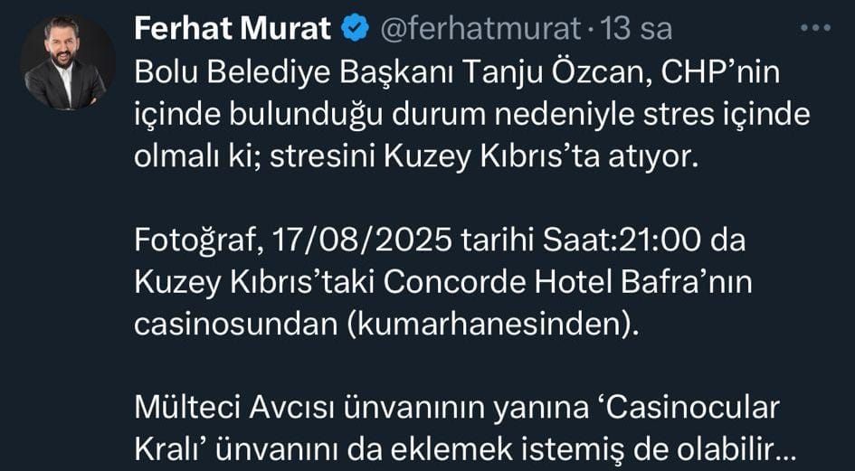 Gazeteci Ferhat Murat'ın X hesabından yaptığı paylaşım, Tanju Özcan'ı sosyal medyada yine gündemin ilk sıralarına taşıdı. Murat, Tanju Özcan'ın Kuzey Kıbrıs'da bir otelin kumarhanesinde çekilmiş fotoğrafını paylaşarak, “Bolu Belediye Başkanı Tanju Özcan, CHP'nin içinde bulunduğu durumu nedeniyle stres içinde olmalı ki, stresini Kuzey Kıbrıs'ta atıyor. Fotoğraf 17/08/2025 tarihi saat 21.00'de Kuzey Kıbrıs'taki Concorde Hotel Bafra'nın casinosundan (kumarhanesinden). Mülteci avcısı ünvanının yanına ‘Casinocular Kralı’ ünvanını da eklemek istemiş de olabilir…” ifadelerini kullandı.