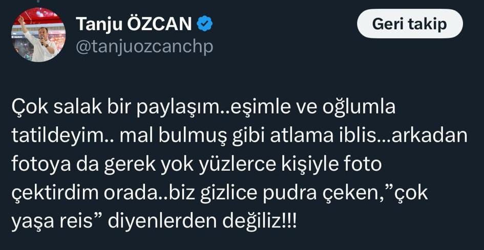 Kurmarhanede çekilmiş fotoğrafın sosyal medyada paylaşılmasının ardından Tanju Özcan X hesabından Gazeteci Ferhat Murat'a yanıt verdi. Özcan, “Çok salak bir paylaşım… eşimle ve oğlumla tatildeyim… Mal bulmuş gibi atlama iblis… arkadan fotoya da gerek yok. Yüzlerce kişiyle foto çektirdim orada…biz gizlice pudra çeken, ‘çok yaşa reis’ diyenlerden değiliz!!!” ifadelerini kullandı.