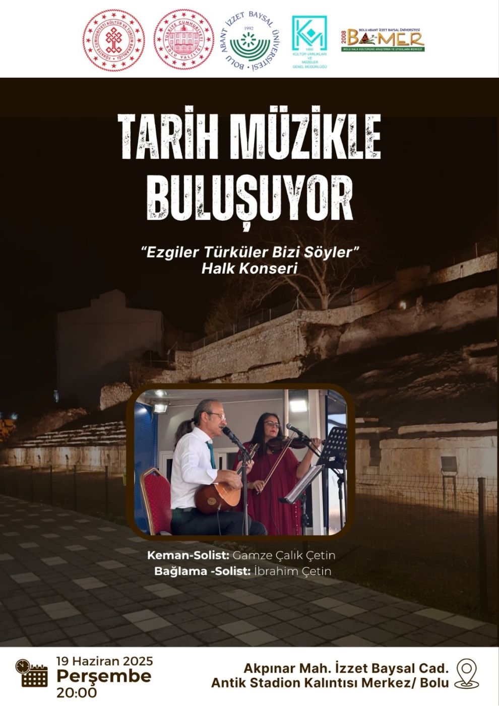 Bolu Abant İzzet Baysal Üniversitesi ve Kültür Varlıkları ve Müzeler Genel Müdürlüğü iş birliğiyle düzenlenen “Tarih Müzikle Buluşuyor” adlı halk konseri, 19 Haziran 2025 Perşembe akşamı saat 20.00’de, Akpınar Mahallesi İzzet Baysal Caddesi üzerindeki Antik Stadion Kalıntısı’nda gerçekleştirilecek.