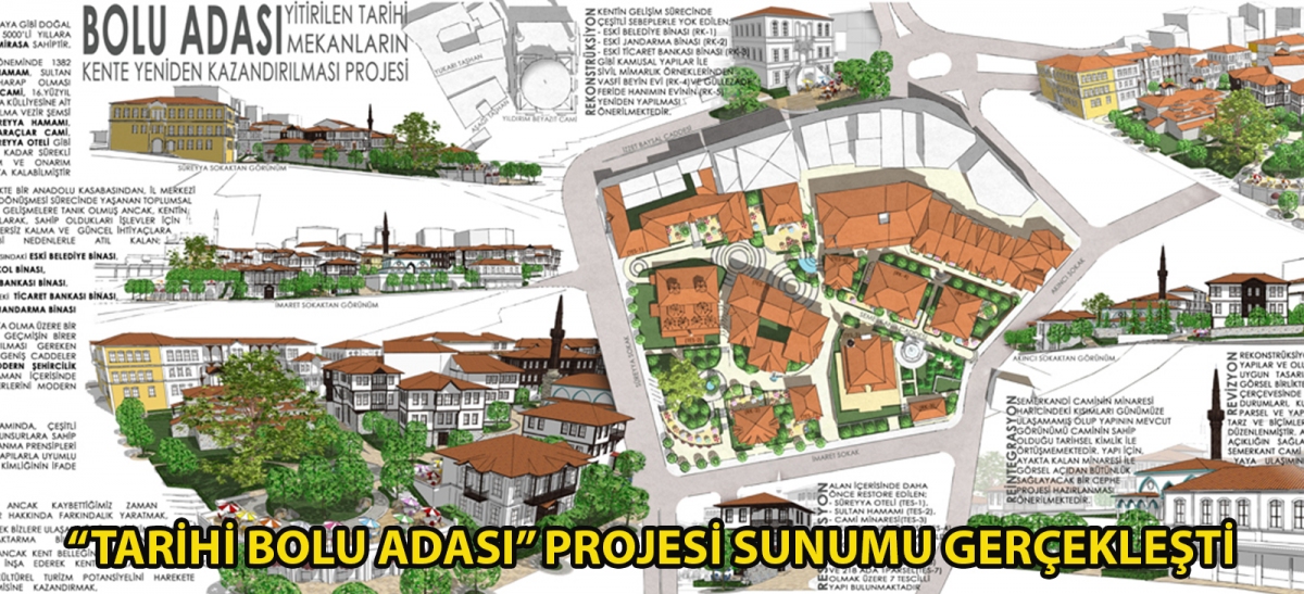 Bolu’nun eskiden var olan ancak çeşitli nedenlerle günümüze kadar ulaşmayan simge tarihi yapılarının ve şehrin geleneksel mimarisinin canlandırılması amacıyla 2 yıllık titiz bir çalışmanın ardından projelendirilen “Tarihi Bolu Adası”nın sunumu pazar günü Bolu Belediyesi İmarethane Sosyal Tesisinde gerçekleşti.