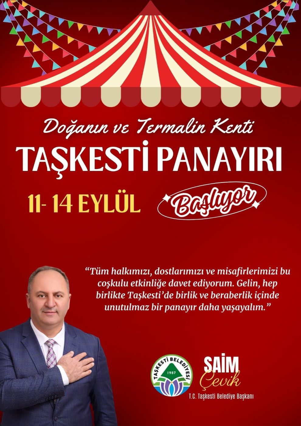 “Göreve geldiğimizde sosyal ve kültürel etkinlikleri beldemize kazandıracağımızın sözünü vermiştik. Geçtiğimiz yıl ilk kez düzenlediğimiz ‘Doğanın ve Termalin Kenti Taşkesti Panayırı’ ile binlerce kişiyi bir araya getirmiştik. Bu yıl da panayırımız birçok etkinliğe sahne olacak. Eski pazar yerinde gıda ve giyim stantları, çocuklarımız için lunapark kurulacak. Yeni pazar yerinde ise değerli sanatçılarımız konser verecek. Tüm halkımızı bu görkemli etkinliğe davet ediyoruz.”
