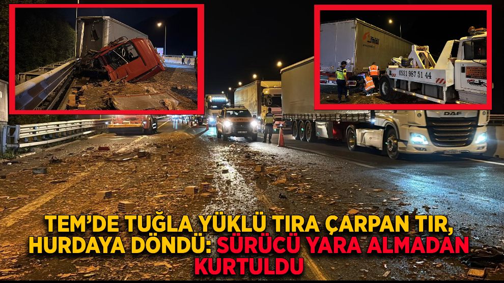 TEM Otoyolu’nun Bolu Dağı Tüneli çıkışında kontrolden çıkan bir tır, tuğla yüklü tıra çarptı. Çarpmanın etkisiyle hurdaya dönen tırdan, sürücü burnu bile kanamadan kurtuldu. Yola dökülen tuğlalar sebebiyle otoyolun İstanbul istikameti tek şeritten kontrollü olarak sağlandı.