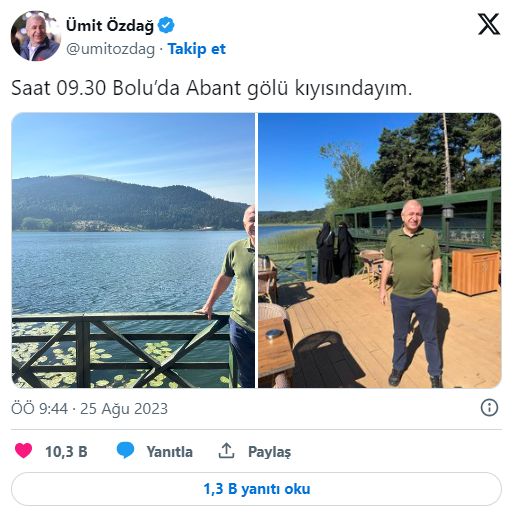 Zafer Partisi Genel Başkanı Ümit Özdağ, Cumhuriyetin 100. yılı kutlamaları için Kastamonu İnebolu’dan Ankara’ya yürüme kararı alırken CHP’den ihraç edilen Bolu Belediye Başkanı Tanju Özcan da, “Bu yürüyüşün bir bölümüne ben de katılmak isterim” dedi. Bu gelişmeler sonrası Bolu Belediye Başkanı Tanju Özcan’ın Zafer Partisine katılacağı yönünde bazı basın yayın organları tarafından iddialar ortaya atıldı. Kamuoyundaki tartışmalar devam ederken Zafer Partisi Genel Başkanı Ümit Özdağ, Bolu’ya geldi. Eşsiz doğası ve manzarası ile ziyaretçi akınına uğrayan Abant’a gelen Genel Başkan Özdağ iki kare fotoğraf paylaştı. Özdağ paylaşımına, “Saat 09.30 Bolu’da Abant gölü kıyısındayım” notunu düştü.