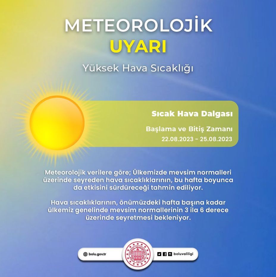 Bolu Valiliği tarafından, Meteoroloji Genel Müdürlüğü verilerine göre yapılan açıklamada sıcak hava dalgasının 22 Ağustos-25 Ağustos tarihleri arasında devam edeceği belirtildi. Bolu Valiliği tarafından yapılan açıklama şu şekilde; Meteorolojik verilere göre; Ülkemizde mevsim normalleri üzerinde seyreden hava sıcaklıklarının, bu hafta boyunca da etkisini sürdüreceği tahmin ediliyor. Hava sıcaklıklarının, önümüzdeki hafta başına kadar Ülkemiz genelinde mevsim normallerinin 3 ila 6 derece üzerinde seyretmesi bekleniyor.