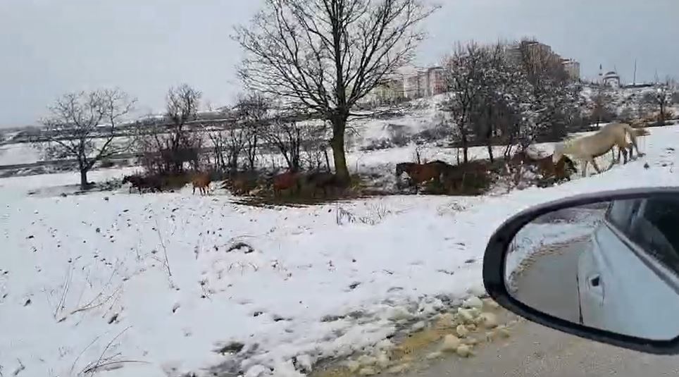Farklı sürüler halinde gezen yılkı atlarının özellikle kış aylarında yiyecek bulmak için yerleşim yerlerine yakın alanlara geldiği biliniyor. Dün başlayan kar yağışı ile birlikte yiyecek bulmakta zorluk çektiği tahmin edilen bir grup yılkı atı Kürkçüler TOKİ Konutlarının yakınındaki tarlalara geldi. Atlar yoldan geçen vatandaşların cep telefonu kamerası ile görüntülendi.