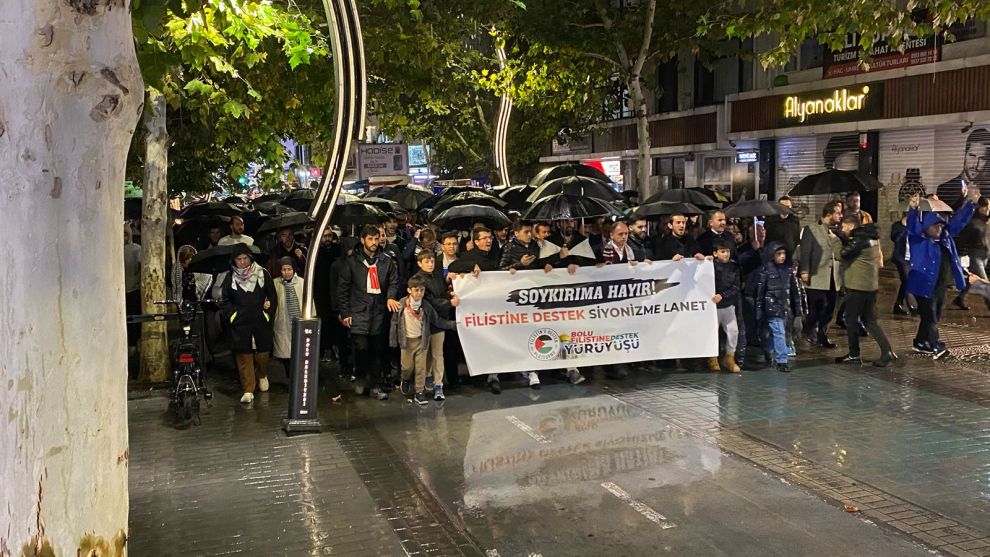 Bolu’nun İzzet Baysal Caddesi’ndeki Kadı Camii önünde bir araya gelen yüzlerce kişi, Bolu Valiliği önüne kadar yürüyerek ‘Filistin’e Destek Yürüyüşü’ gerçekleştirdi. Filistin'e Destek Platformu'nun öncülüğünde gerçekleşen yürüyüşe; Bolu Valisi Abdulaziz Aydın, Bolu İl Müftüsü Hüseyin Demirtaş, Eski Refah Partisi Milletvekili Mustafa Yünlüoğlu, BAİBÜ Genel Sekreteri İhsan Ağcan, Kıbrısçık İlçe Müftüsü İrfan Fidan, İHH Başkanı Fethi Sarımsakçı, BOLİMDER Başkanı Hüseyin Altundağ, Hayrat Vakfı Başkanı Ferit Kaya, Eğitim-Bir-Sen Bolu 1 Nolu Şube Başkanı Ahmet KOÇAK, TÜGVA Başkanı Muhammed Mustafa Özdere, Seben İlçe Milli Eğitim Müdürü Salih Celepci ile Bolu halkı katıldı.